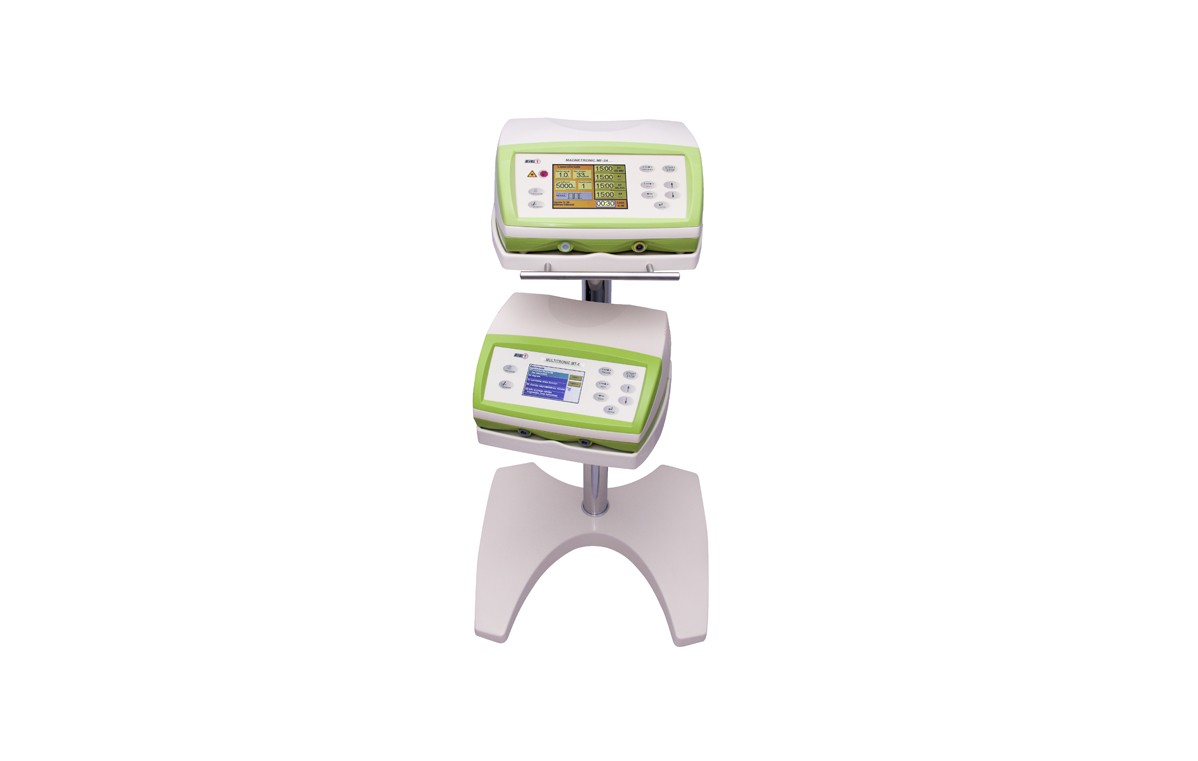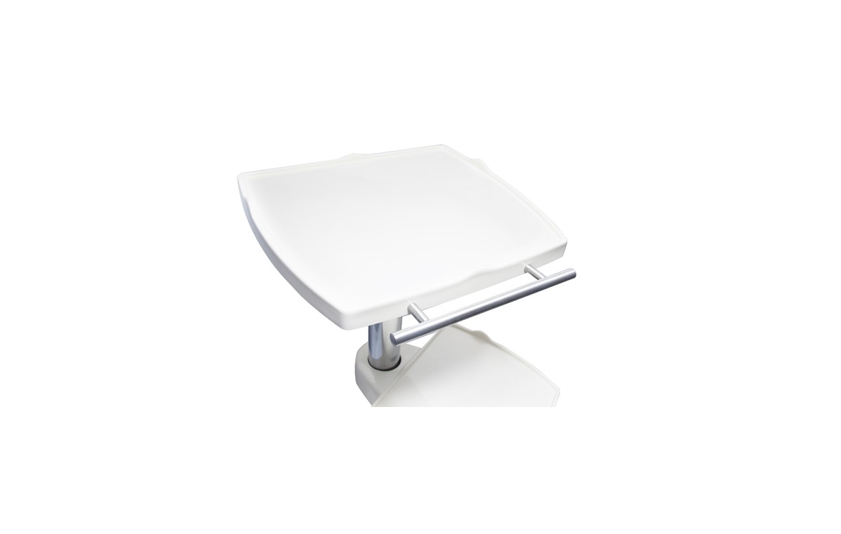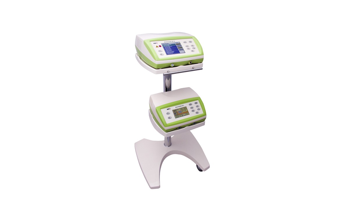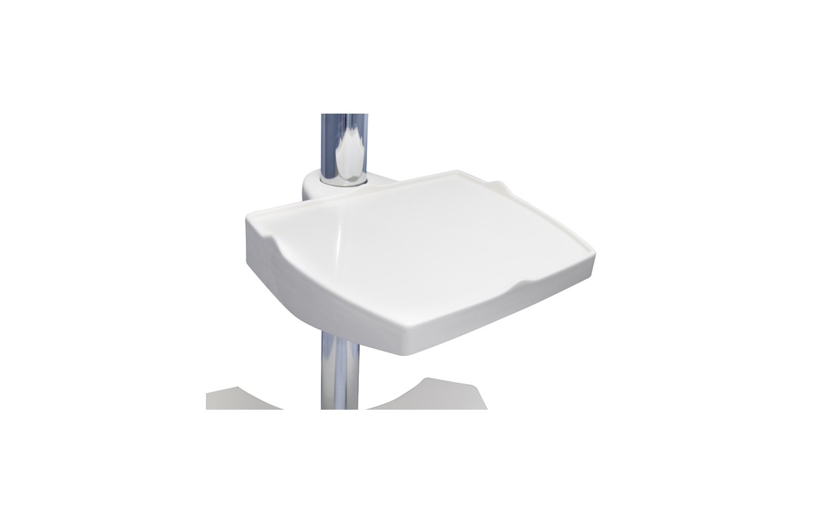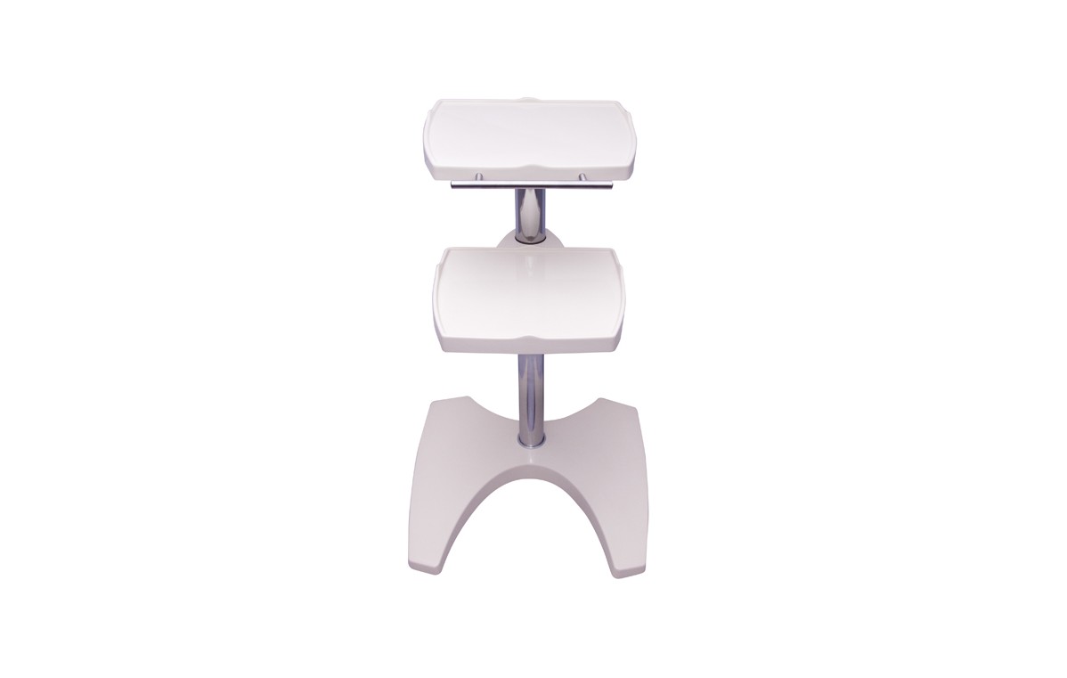 Mobilny stolik pod aparaty w nowoczesnej linii stylistycznej pasującej do naszych najnowszych aparatów i aplikatorów. Ergonomiczny uchwyt, solidne kółka i hamulce pozwalają na wygodne operowanie stolikiem. Odpowiednie uchwyty przy rączce pozwalają na wygodne odkładanie przewodów pacjenta. Stolik posiada dwie półki, przy czym dolną można umocować na dowolnej wysokości i pod dowolnym kątem, co ułatwia zagospodarowanie przestrzeni w miejscu wykonywania zabiegów. Półki są zabezpieczone na krawędziach przed możliwością przypadkowego zrzucenia aparatu.