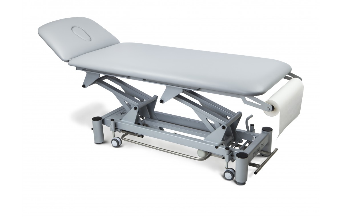Stół do rehabilitacji 2 cz. Master PRO charakteryzuje się stabilną, metalową konstrukcją malowaną proszkowo. Stół regulowany jest przy pomocy siłownika elektronicznego sterowanego pilotem ręcznym. Stół 2 cz. występuje także w konfiguracji z siłownikiem hydraulicznym regulowanym przy pomocy kilkukrotnego naciśnięcia stopą dźwigni znajdującej się przy siłowniku. W standardzie zastosowano dwuczęściowe leże z otworem na twarz i zatyczką w podgłówku. Regulacja podgłówka odbywa się poprzez sprężynę gazową.