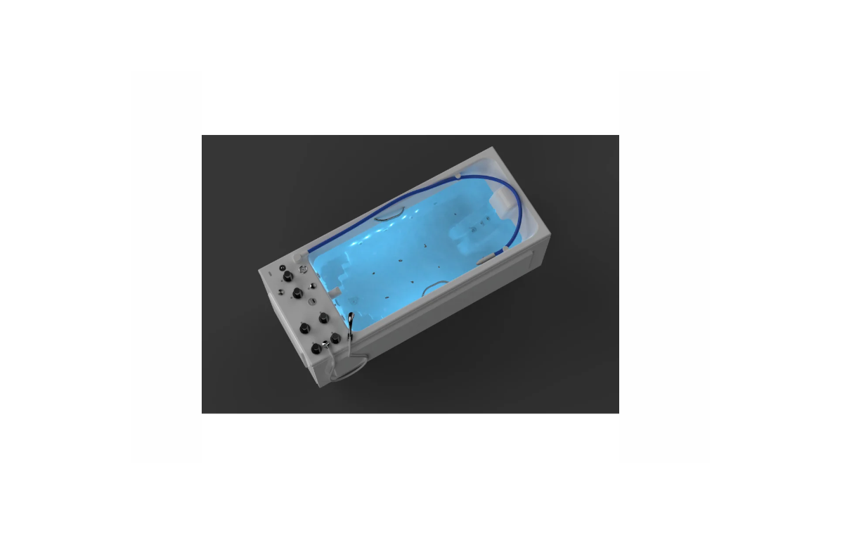 Wanna składa się z korpusu z wysokiej jakości akrylu (wzmocniony poliestrowym laminatem dla przedłużenia trwałości) z pulpitem sterującym. Czterostronna obudowa urządzenia chroni ją przed uszkodzeniami zapewniając jednocześnie estetyczny i nowoczesny wygląd. Wanna do hydroterapii Aquameden osadzona jest na czterech, regulowanej wysokości nóżkach wykończonych gumowymi ochronnymi nasadkami.